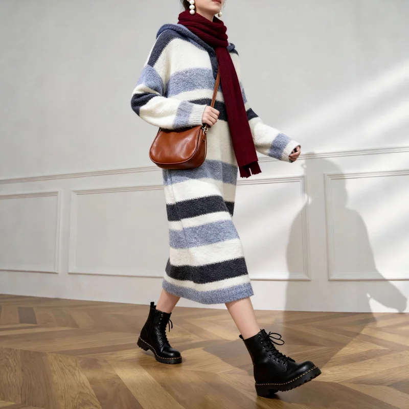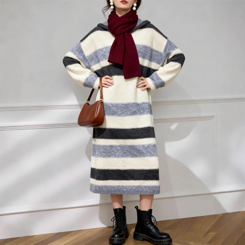 Vestido casual para mujer con capucha y diseño de rayas. Cómodo, cálido y de corte holgado, ideal para primavera y otoño. Perfecto para un look moderno y relajado.